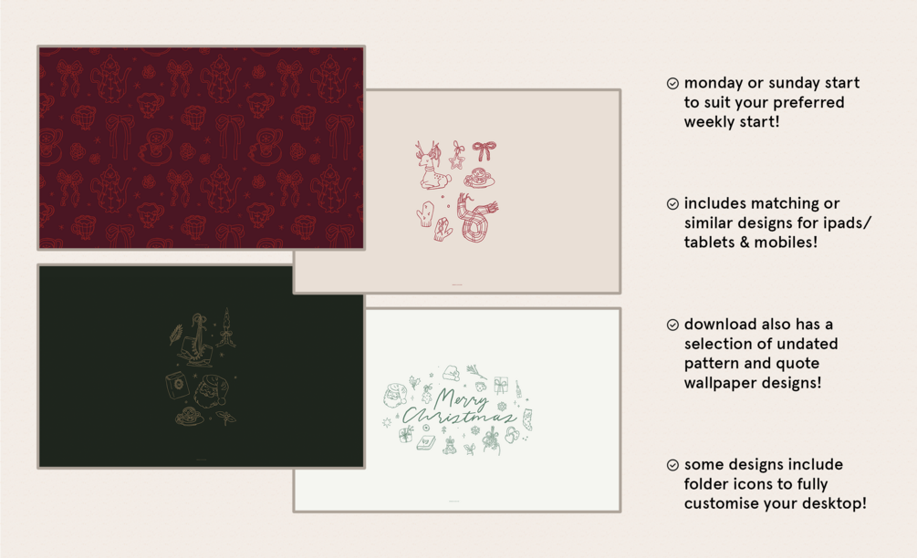 Keep your devices organised and a monthly calendar easily accessible as a background! Including 20 designs for computers, tablets and phones - there should be a style perfect for you. Includes Monday & Sunday starts to suit your preferences.