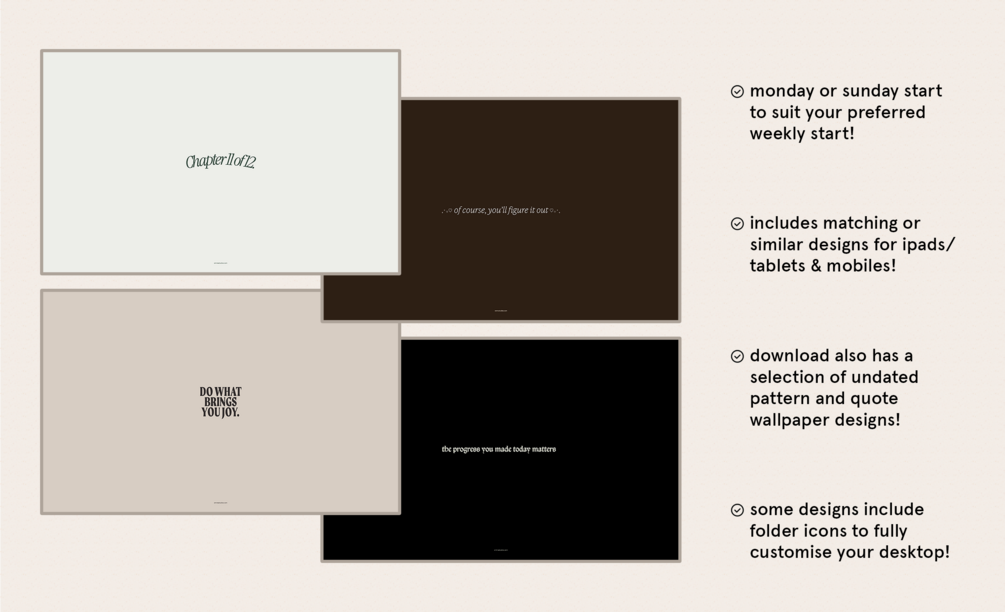 Keep your devices organised and a monthly calendar easily accessible as a background! Including 20 designs for computers, tablets and phones - there should be a style perfect for you. Includes Monday & Sunday starts to suit your preferences.