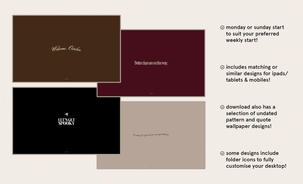 Keep your devices organised and a monthly calendar easily accessible as a background! Including 24 designs for computers, tablets and phones - there should be a style perfect for you. Includes Monday & Sunday starts to suit your preferences.
